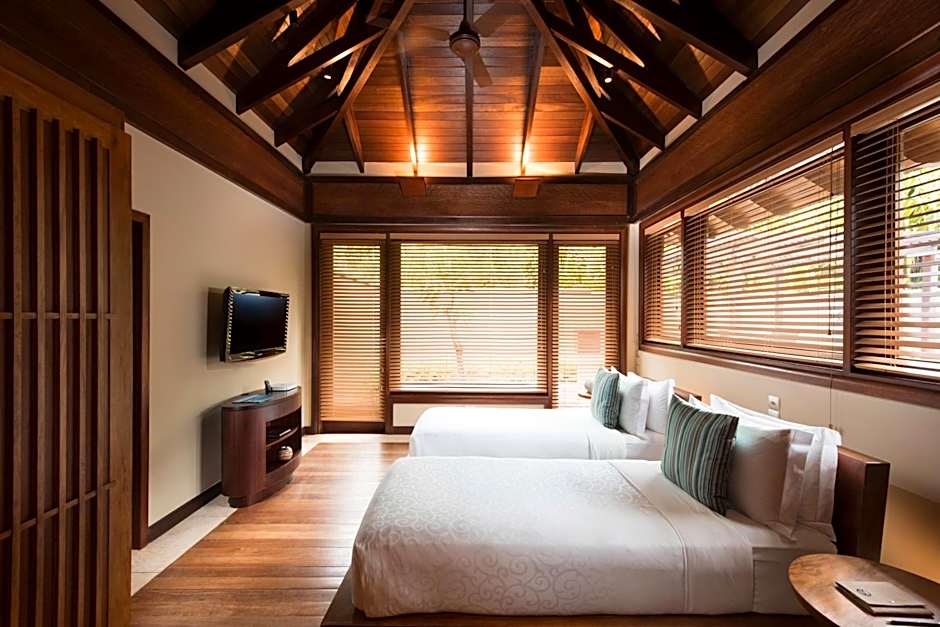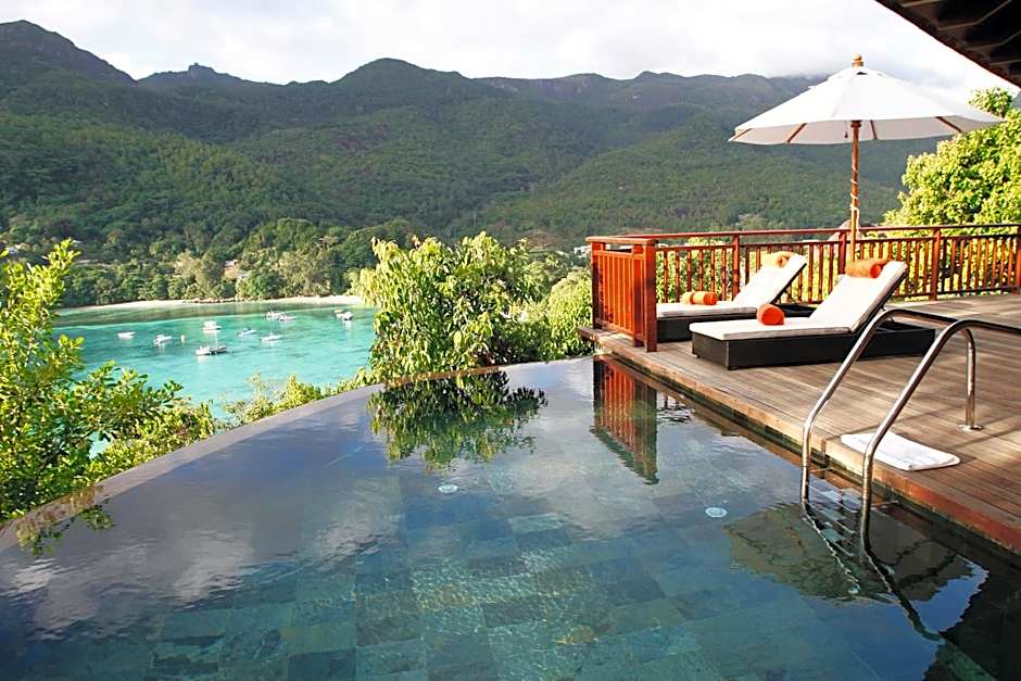 Please note that children cannot be accommodated in this room type. This large air-conditioned villa offers a private pool with sun chairs and a garden set on the edge of the hill top. There is a seating area with flat-screen TV and dining area. There is a private luxury bathroom complete with a bath, double basin and walk-in shower. There is a fully furnished terrace overlooking the North Beach and the tropical hillside.